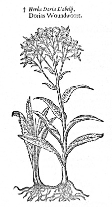 1. Herba doria. This plant hath long and large thick and fat leaves, sharp pointed, of a blueish green like unto Woad, which being broken with the hands hath a pretty spicy smell. Among these leaves riseth up a stalk of the height of a tall man, divided at the top into many other branches, whereupon grow small yellowish flowers, which turneth into down that flieth away with the wind. The root is thick almost like Helleborus albus.