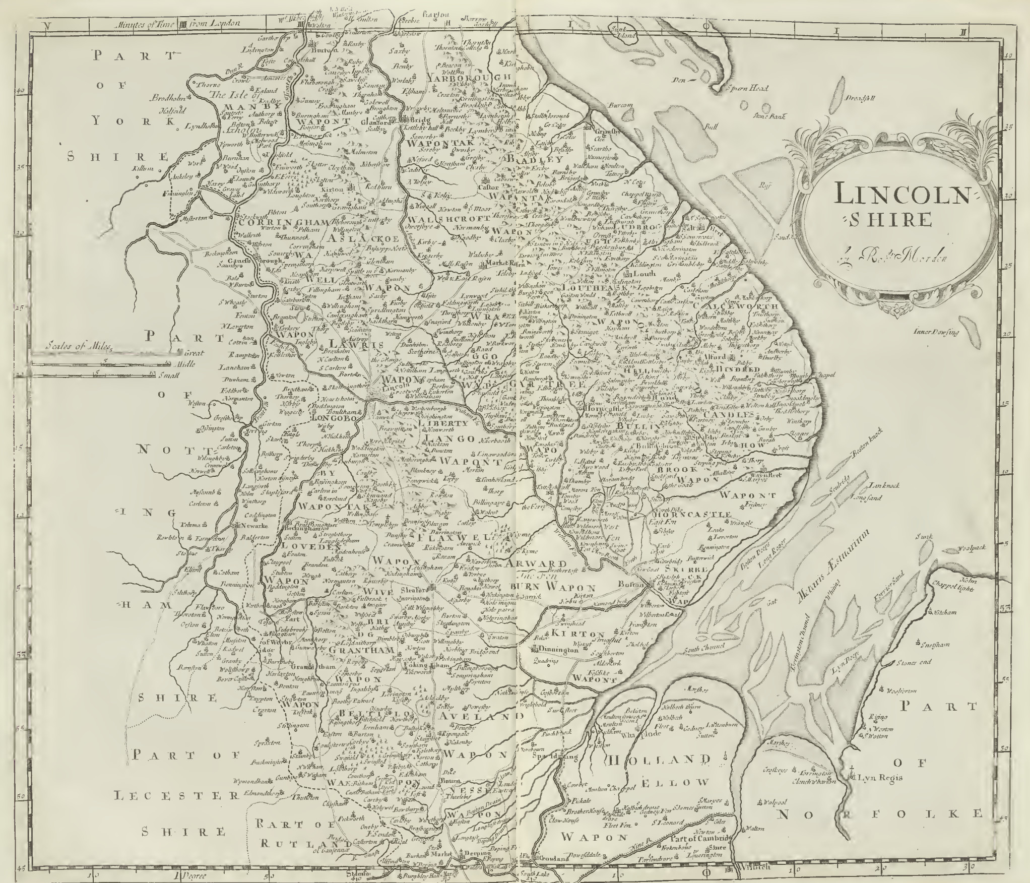 this county of Lincoln borders upon Rutland on the East, called by the Saxons Lincollscyre, by the Normans upon their first entrance into this island (by a transposal of letters) Nicolshire, but commonly now Lincolnshire. 'Tis a very large county, being almost sixty miles long, and in some places above thirty broad, fitted by the mildness of the air for the produce of corn and feeding of cattle, adorned with many towns and watered with many rivers. On the East side it shoots out a foreland of great compass, which bounds upon the German Ocean; on the North it reaches as far as the Abus or Humber, an arm of the sea; on the West it joins to Nottinghamshire, and on the South 'tis parted from Northamptonshire by the river Welland. The whole county is divided into three parts, Holland, Kesteven, and Lindsey as we in our language call it.