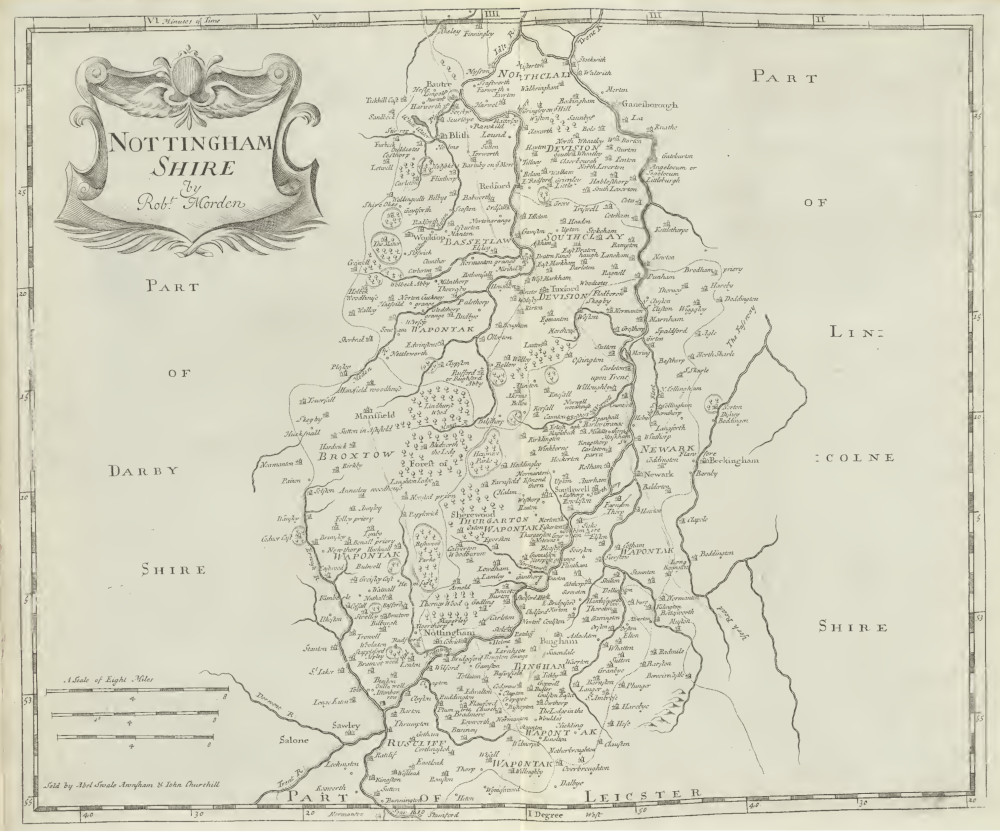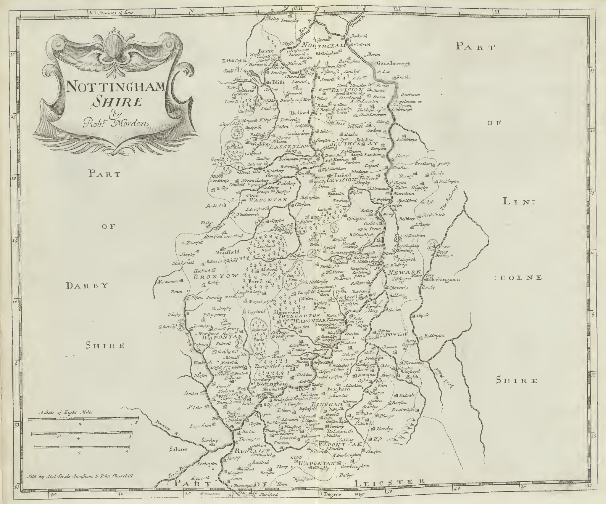 in the West part of this county (called the Sand,) where the Erewash, a small river, runs toward the Trent, we see Strelley , heretofore Strellegh, which hath given a name and seat to the Strelleys knights (commonly called Sturly) one of the most ancient and famous families of this county. More inward lies Sherwood, which some interpret a clear wood, others a famous wood; formerly a close shade, with the boughs of trees so entangled in one another, that a single person could hardly walk in the paths of it. At present it is much thinner, yet it still feeds an infinite number of deer and branchy-headed stags; and has some towns in it, whereof Mansfield is the chief, a very plentiful market; the name of which is made use of for an argument by some , who assert the antiquity of the family of Mansfeld in Germany, and that the first Earl of Mansfeld was at the celebration of the round table with our Arthur; and that he was born here. Our kings were formerly wont to retire hither for the sake of hunting, and, that you may have it in the very words of an old inquisition, Henry Fauconberge held the Manor of Cuckney in this county by serjeanty, for shoeing the King's horse when he came to Mansfeld . Many small rivers spring out of this wood, and run towards the Trent; the chief of them is Idle, upon which near Idleton in the year 616, the great success and fortune of Ethered, a most potent King of the Northumbrians, stopped and failed him. For whereas he had formerly always fought with great success, here his fortune varied, and he was cut off, being defeated by Redwald King of the East Angles, who set Edwin (excluded then and deprived of the throne of his ancestors) over Northumberland. The course of this little river lies at no great distance from Markham, a small village; but yet it has given name to the Markhams, a family very famous heretofore both for antiquity and virtue ; the greatest ornament of which was J. Markham, who was Lord Chief Justice of England, and tempered his judgments with so much equity (as you may read in the histories of England) that the glory of him will never perish in after ages . Six miles from hence to the westward stands Worksop, known for its great produce of liquorice, and famous for the Earl of Shrewsbury's house there, built in this age by George Talbot Earl of Shrewsbury, with magnificence becoming the state of so great an Earl, and yet not to contract envy. To the Talbots it came with a great inheritance from the Lovetofts first lords of it in the Norman times, by the Furnivals and Nevilles. Of these Lovetofts, G. Lovetoft in Henry the First's time built a monastery here; the ruins of which are still to be seen among very pleasant meadows, on the East side of the town: but the West part of the church is yet remaining with two towers, very fair and beautiful. A little higher upon the same river I saw Blyth, a noted market town, which was fortified with a castle (as I was informed) by Bulley or Busly, a nobleman of Norman extract; but at this day, hardly the ruins of it are visible; so destructive is age to everything. But the little monastery there was built by Roger Busly and Fulk de Lisieurs, and this is almost the last town of Nottinghamshire to the northward, unless it be Scrooby, a little town belonging to the Archbishop of York, seated in the very edge of it.