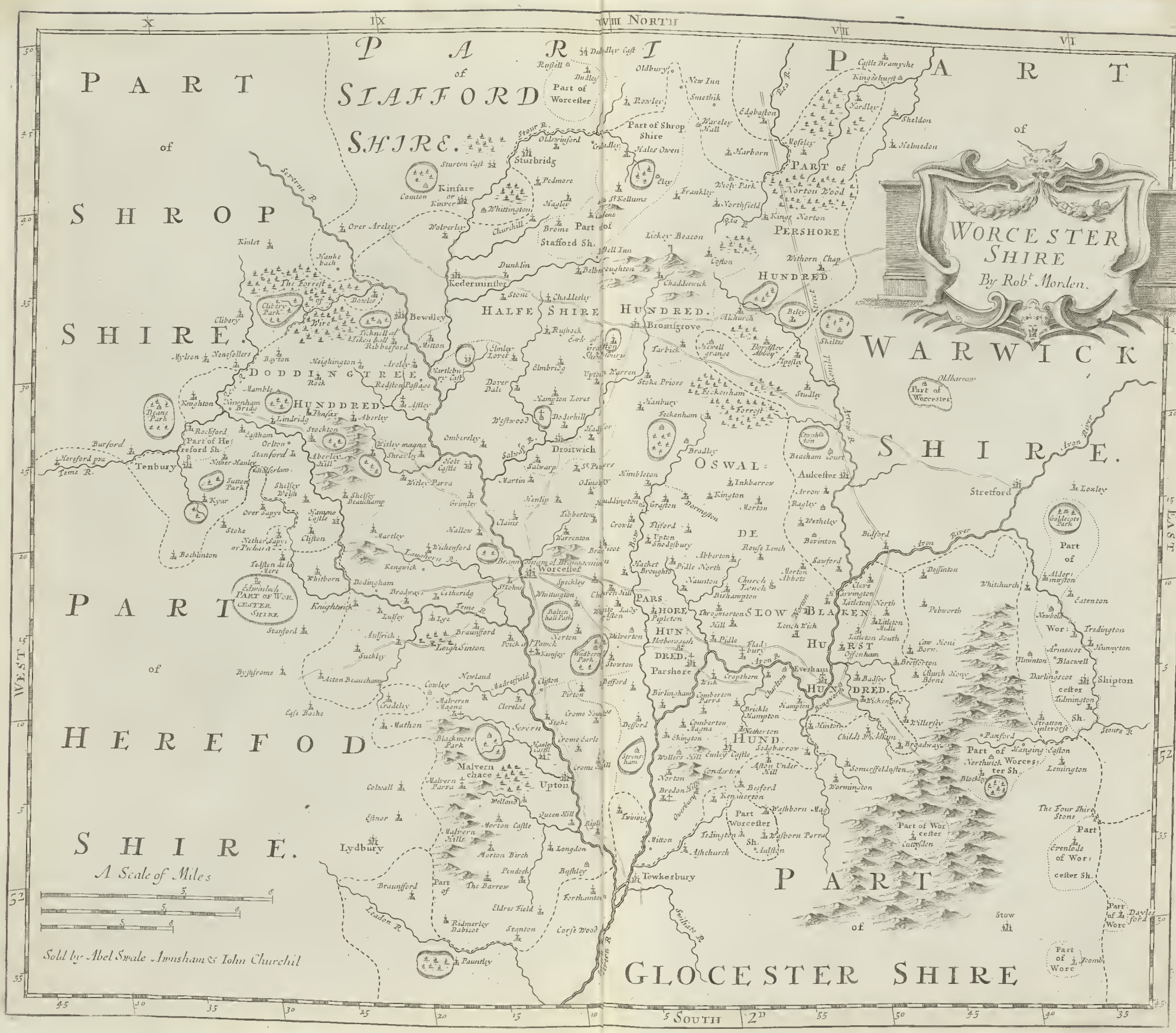 neither is it less happily accommodated with water, for it hath in all parts very fine rivers, which furnish it plentifully with fish of the most delicious kinds. Not to mention those which are less remarkable, the most noble river of Severn directs the course of its rich stream from North to South through the very middle of the county, and Avon waters the South part thereof in its way out of Warwickshire into Severn.