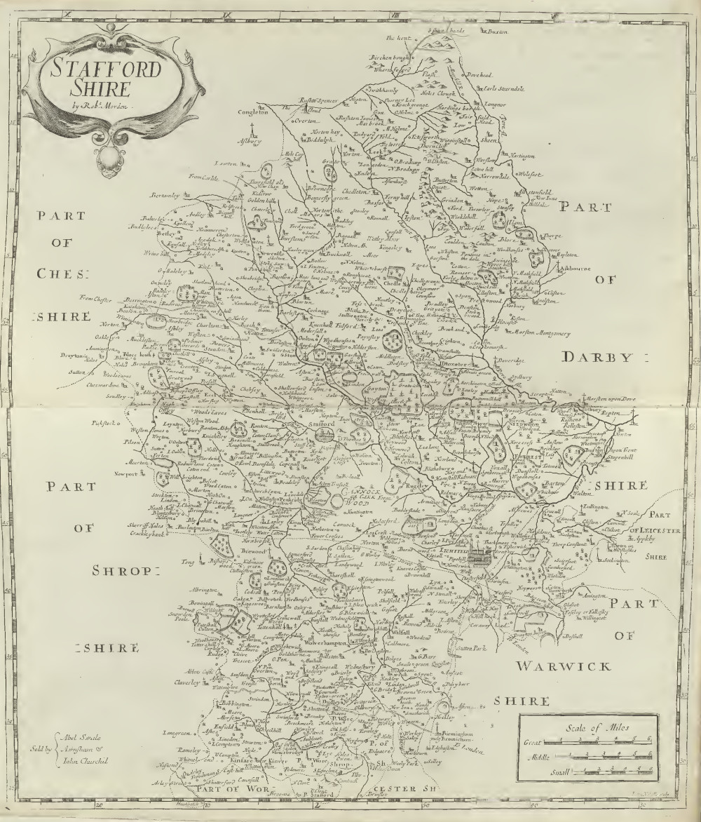 the third part of that country inhabited by the Cornavii, now Staffordshire, in Saxon Stafford-Scyre (the people whereof, as living in the heart of England, are called in Bede Angli Mediterranei, is bounded on the East by Warwickshire and Derbyshire, on the South by the county of Worcester, and on the West by Shropshire;) lies from South to North almost in the form of a rhombus, being broad in the middle, but narrow and contracted towards the ends of it. The North part is mountainous, and less fertile; but the middle, which is watered by the Trent, is fruitful, woody, and pleasant, by an equal mixture of arable and meadow grounds; so is also the South, which has much pit-coal and mines of iron; but whether more to their loss or advantage, the natives themselves are best judges; and so I refer it to them.