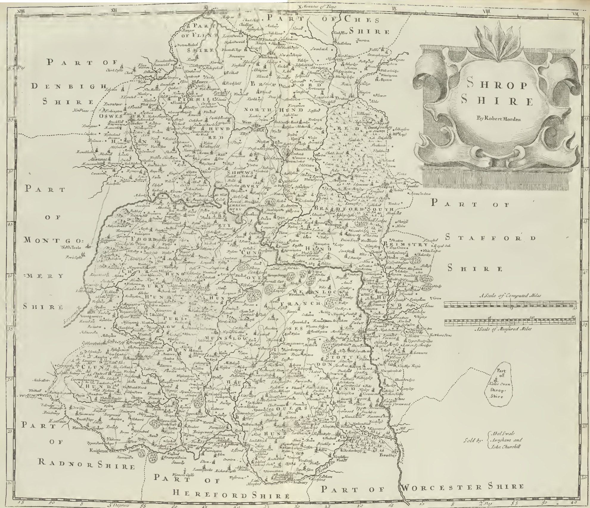 The fourth division of that country which (as 'tis generally believed) the Cornavii did inhabit, was known in the Saxons' time by the name of Scrobbes-byrig-scyre, and Scrobb-scire; as by the later writers Scropscire, and Salopschire; and others nearer our times, Schropshire, Sciryp-scyre and Shrobbe-scyre, which we call Shropshire, and the Latins Comitatus Salopiensis. It much exceeds the rest in compass, and is not inferior to any of them in the fruitfulness of its soil, or the pleasure it affords. 'Tis bounded on the East by Staffordshire, on the West by Montgomeryshire and Denbighshire, on the South by Worcestershire, Herefordshire, and Radnorshire, and northward by Cheshire. 'Tis environed on every side with towns and castles, being a frontier county, or (as Siculus Flaccus words it) ager arcifinius, of great use in checking the excursions of their Welsh neighbours; from whence, the borders of it towards Wales were called in the Saxon language the Marches, being the limits between them and the English. In this country some noblemen were intitled Barones Marchiae, Lords Marchers, who exercised within their respective liberties a sort of Palatinate jurisdiction Palatinate jurisdiction, and held courts of justice to determine controversies among their neighbours, and prescribed for several privileges and immunities; one of which was, that the King's writs should not run here in some causes. But notwithstanding that, whatever controversy arose concerning the right of Lordships, or their extent, such were only determinable in the King's courts of justice. We find these styled formerly Marchiones de Marchia Walliae, Marquesses of the Marches of Wales, as appears by the Red Book in the Exchequer, where we read, that at the coronation of Queen Eleanor, consort to Henry the Third, these Marquesses, or Lords Marchers of Wales, viz. John FitzAlan, Ralph de Mortimer, John de Monmouth, and Walter de Clifford, in behalf of the Marches, did claim in their right, to provide silver spears, and bring them this privilege of supporting the square canopy of purple silk at the coronation of the kings and queens of England. But peaceful times and kingly power has by degrees abolished the private rights of these lords which they enjoyed and insolently exercised over the poor inhabitants in the Marches; and the right to support the canopy belongs (amongst other immunities and privileges) to the inhabitants of the Cinque Port towns. Yet I would not be understood (therefore I use it as a caution) that all this country belonged to the Cornavii, but so much only as lies on this side the Severn. That on the other side, was peculiar to the Ordovices, who spread themselves far; some part of whose country (as also some small parcels on this side Severn, which belonged to the Lords Marchers) were laid to this shire not long since by Act of Parliament. This division of the whole shire is the more proper and convenient, because the river Severn parts it from the West, to the South-east point. 'Tis bounded on the South side of Severn by the River Teme, in Welsh, Tifidiauc, which at some distance is joined by the River Clun, in Welsh Colunwy, and riseth higher up in the country, not far from a well-frequented little town, called Bishop's Castle, because it belonged to the bishops of Hereford, whose diocese takes in a great part of this shire. It gives denomination to Clun or Clune Castle, which was built by the FitzAlans, who were descended from one Alan the son of Flaold a Norman, and were afterwards Earls of Arundel, at such time as they were Lords Marchers here, and annoyed the Welshmen with their frequent inroads: but where it meets the River Teme, among several dangerous fords, ariseth a hill of great antiquity, called Caer Caradoc, because about the year of our Lord 53, Caratacus a renowned British King, environed it with a bulwark of stone, and defended it gallantly against Ostorius and the Roman legions; till they, by making a breach with no great difficulty in so slight a stone-work, (some ruins of which are yet to be seen) forced the disarmed Britons to betake themselves to the tops of the mountains. The King himself escaped by flight, but his wife, daughter, and brethren were taken prisoners; yet was not his escape successful, (there being no security against ill destiny,) for afterwards he was delivered up to Ostorius by Queen Cartismandua (with whom he had intrusted himself) and carried to Rome; where, notwithstanding he had engaged the Romans in so tedious and toilsome a war, he procured his pardon and his family's of Claudius Caesar by no base or precarious solicitation, but by a noble and majestic freedom of address. For the taking this hill, and Caratacus prisoner, a triumph was decreed to Ostorius; nor did the captive King seem a less prize to the senate, than the two royal prisoners, Syphax, whom P. Scipio, and Perses, whom L. Paulus presented to the Romans. And notwithstanding our sorry historian has omitted both the account of this battle, and this gallant Britain, yet is not his memory, nor the story, extinct among the country people. They tell us, that a King was beaten upon this hill, and in the Welsh-book called Triades, amongst three of the most renowned British heroes, Caradauc Urichfras is the chief, who to me seems undoubtedly to have been this very Caratacus.