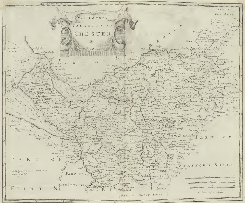 a little after Croco is got beyond Brereton, it comes to Middlewich, situated near its union with the Dane; where there are two fountains of salt-water (separated from one another by a little brook) which they call sheaths. The one of them is not opened, but at set times; to prevent stealing away the water, which is of a more peculiar virtue and excellence than the other. Whence the Dane runs by Bostock, formerly Botestock, the ancient seat of the noble and knightly family of the Bostocks, which by marriage with Anne the only daughter of Ralph, son and heir of Sir Adam de Bostock Kt. went together with a vast estate, to John Savage. Out of this ancient house of the Bostocks, as out of a fruitful stock, has sprung a numerous race of the same name, which have spread themselves in Cheshire, Shropshire, Berkshire, and other places. Beneath Northwich the Dane unites itself with the Weaver, and then runs on to the West in a straight line, and receives from the East, Peover, that gives its name to the town Peover, by which it passes. This is the seat of that noble and ancient family, the Meinilwarrens, now commonly Mainwaring, one of which called Ralph, married the daughter of Hugh kevelioc Earl of Chester, as appears by an old charter now in the hands of Ranulph the heir of this house. The course of the Weaver is next by Winnington, which both gives seat and name to the famous and ancient family of the Winningtons: and then runs at some little distance from Merbury, which derives that name from a pool under it, and gives the same to the famous family of the Marburys. From hence the river runs near Dutton, the estate of that worthy family the Duttons, descended from one Hudardus, who was related to the Earls of Chester. This family by an old custom, hath a particular authority over all pipers, fiddlers, and harpers of this county, ever since one R. Dutton, an active young gentleman of a great spirit, with a rabble of such men, rescued Ranulph the last Earl of Chester, when he was beset by the Welsh, and in danger of being besieged by them. Nor must I forget to take notice of Nether Whitley in these parts, out of which came the Tuschetts or Towchetts, who are barons Audley of Heighley. Now the Weaver flowing between Frodsham, a castle of ancient note, and Clifton, at present called Rocksavage, a new house of the Savages, who by marriage have got a great estate here; runs at last into the estuary of the Mersey, a river which running down between this county and Lancashire, empties itself here; after it has first passed by some inconsiderable towns, and among the rest by Stockport, which formerly had its Baron ; and received the river Bollin, which flows out of the large forest of Macclesfield, wherein stands the town Macclesfield , from whence the forest has its name. Here was a college founded by T. Savage, first, Bishop of London, and then Archbishop of York; in which several of that noble family, the savages, are buried; and also Dunham, which from Hamon de Mascy by the Fittons and Venables came hereditarily to the famous family of Booth. From hence the Mersey goes on to Thelwall before it is much past Knutsford, i.e. Canute's ford, whereof there are two, the upper and the lower; and then Lee, from whence there is a family of the same name, famous not only for its gentle race, but for the number of its branches. As for Thelwall, 'tis now an obscure village, though formerly a large city, founded by King Edward the Elder; and so called, as Florilegus witnesses, from the trunks of trees fixed in the ground, which, instead of a wall, enclosed it. For the Saxons express the trunk of a tree by the word dell, and the Murus by wall, [as we do at this day.] Upon the mouth of this river stands Runcorn, built in the very same age by Ethelfleda , and now likewise reduced to a few cottages. Since I have so often mentioned this Edelfleda, Ethelfleda, or Elfleda, it will not be improper to note, that she was sister to King Edward the Elder, and wife to Ethelred a petty prince of the Mercians; and that after her husband's death she governed eight years in very troublesome times, to her great praise and honour. In Henry of Huntingdon there is this encomium of her: