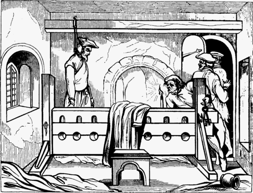 "After colouring of the murther betwixt Charles and the chancellour conspired, the chancellour called to him one Iohn Spalding, belringer of Pauls, and deliuered to the same belringer the keyes of the Lollards Tower, giving to the said belringer a great charge, saying: I charge thee to keepe Hun more straitely then hee hath beene kept, and let him have but one meale a day. Moreouer I charge thee, let no body come to him without any licence, neither to bring him shirt, cappe, kirchiefe, or any other thing, but that I see it before it come to him. Also before Hunne was carried to Fulham, the chancellor commanded to bee put vpon Huns necke a great coller of iron with a great chaine, which is too heauie for any man or beast to weare, and long to endure.