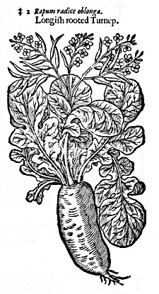 There be sundry sorts of turnips; some wild; some of the garden; some with round roots globe fashion; other oval or pear fashion; and another sort longish or somewhat like a Radish: and of all these there are sundry varieties, some being great, and some of a smaller sort.