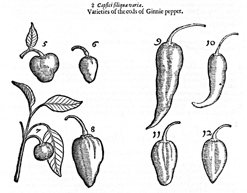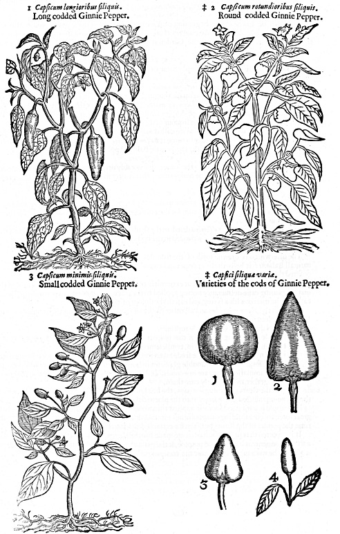 There are many other varieties of Guinea Pepper, which chiefly consist in the shape and colour of the cods: wherefore I thought good (and that chiefly because it is a plant that will hardly brook our climate) only to present you with the figures of their several shapes, whereof the cods of some stand or grow upright, and other some hang down: such as desire further information of this plant, may be abundantly satisfied in Clusius his Curęposter. from pag. 95 to pag. 108, where they shall find these treated of large in a treatise written in Italian by Gregory de Regio, a Capuchin friar, and sent to Clusius, who translating it into Latin, left it to be set forth with other his observations, which was performed 2 years after his death, to wit Anno Domini 1611. The figures we here give are the same which are in that tractate.