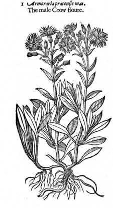The Crow-Flower is called in Latin Armoraria sylvestris, and Armoracia: of some, Flos cuculi, but not properly; is also called Tunix: of some, Armeria, Armerius flos primus of Dodonĉus, and likewise Caryophillus minor sylvestris foliis latioribus: in Dutch, Craeynbloemkens: that is to say, Cornicis flores: in French, Cuydrelles: ln English, Crow-flowers, Wild Williams, Marsh Gillyflowers, and Cuckoo Gillyflowers,