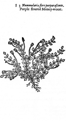 3. There is another kind of Moneywort which hath many very slender creeping branches which here and there put forth fibres, and take root again: the leaves are small and round, standing by couples one against another; and out of the bosoms come slender footstalks bearing pretty little whitish purple flowers consisting of five little leaves standing together in manner of a little bell-flower, and seldom otherwise: the seed is small, and contained in round heads. This grows in many wet rotten grounds and upon bogs: I first found it Anno 1626, in the Bishopric of Durham, and in two or three places of Yorkshire, and not thinking any had taken notice thereof, I drew a figure of it & called it Nummularia pusilla flore ex albo purpurascente; but since I have found that Bauhin had formerly set it forth in his Prodromus by the name of Nummularia flore purpurascente. It grows also on the bogs upon the heath, near Brentwood in Essex: it flowers in July and August.