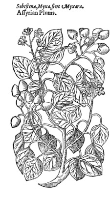 Sebestens are also a kind of plums: the tree whereof is not unlike to the Plum tree, saving it groweth lower than the most of the manured Plum trees; The leaves be harder and rounder; the flowers grow at the tops of the branches, consisting of five small white leaves, with pale yellowish threads in the middle, like those of the Plum tree: after followeth the fruit like to little plums, fastened in little skinny cups, which when they be ripe are of greenish black colour, wherein is contained a small hard stone.The fruit sweet in taste, the pulp or meat is very tough and clammy.