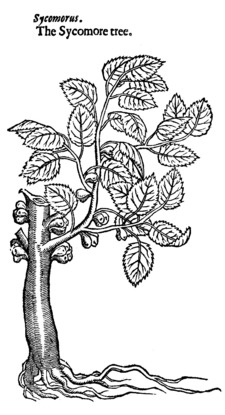 The Sycomore tree is of no small height, being very like to the Mulbery tree in bigness & show, as also in leaf: the fruit is as great as a fig, and of the same fashion, very like in juice and taste to the wild fig, but sweeter, and without any grains or seeds within, which groweth not forth of the tender boughs, but out of the body and great old arms very fruitfully: this tree hath in it plenty of milky juice, which so soon as any part is broken or cut, doth issue forth.