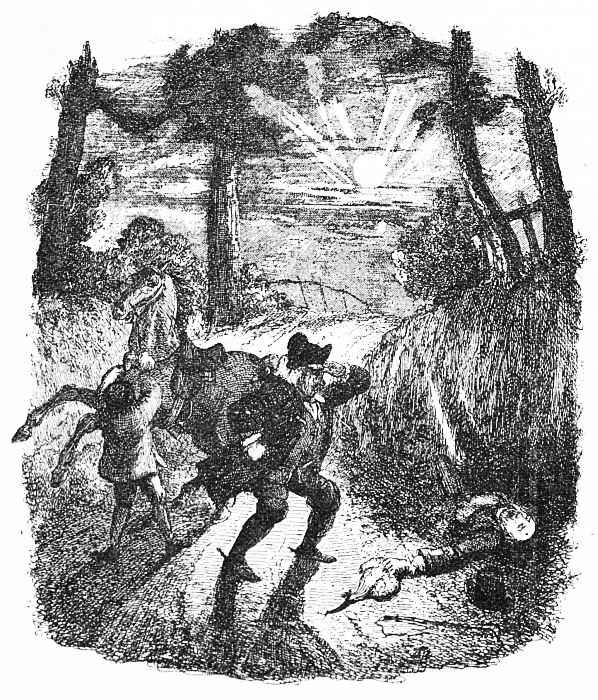 After several hours of patient attention, Mr. Moneypenny had succeeded in introducing to the notice of seven little expectant brothers and sisters a 'remarkably fine child,' and was now hurrying home in the sweet hope of a comfortable 'snooze' for a couple of hours before the announcement of tea and muffins should arouse him to fresh exertion. The road at this particular spot had, even then, been cut deep below the surface of the soil, for the purpose of diminishing the abruptness of the descent, and, as either side of the superincumbent banks was clothed with a thick mantle of tangled copsewood, the passage, even by day, was sufficiently obscure, the level beams of the rising or setting sun, as they happened to enifiade the gorge, alone illuminating its recesses. A long stream of rosy light was just beginning to make its way through the vista, and Mr. Moneypenny's nose had scarcely caught and reflected its kindred ray, when the sturdiest and most active cob that ever rejoiced in the appellation of a 'Suffolk Punch,' brought herself up in mid career upon her haunches, and that with a suddenness which had almost induced her rider to describe that beautiful mathematical figure, the parabola, between her ears. Peggy -- her name was Peggy -- stood stock-still, snorting like a stranded grampus, and alike insensible to the gentle hints afforded her by band and heel.